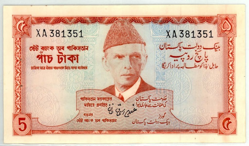 Pakistan 5 Rupee Banknote Signature by Ghulam Ishaq Khan prefix XA. P-25b Condition UNC with Pinhole