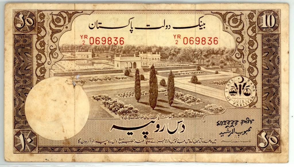 Category Banknotes Lot number 641 Starting Bid 500 Lot Pictures Pakistan 10 Rupee Banknote Signature by Mehbub-ur–Raschid prefix YR/2.P-16h Condition XF
