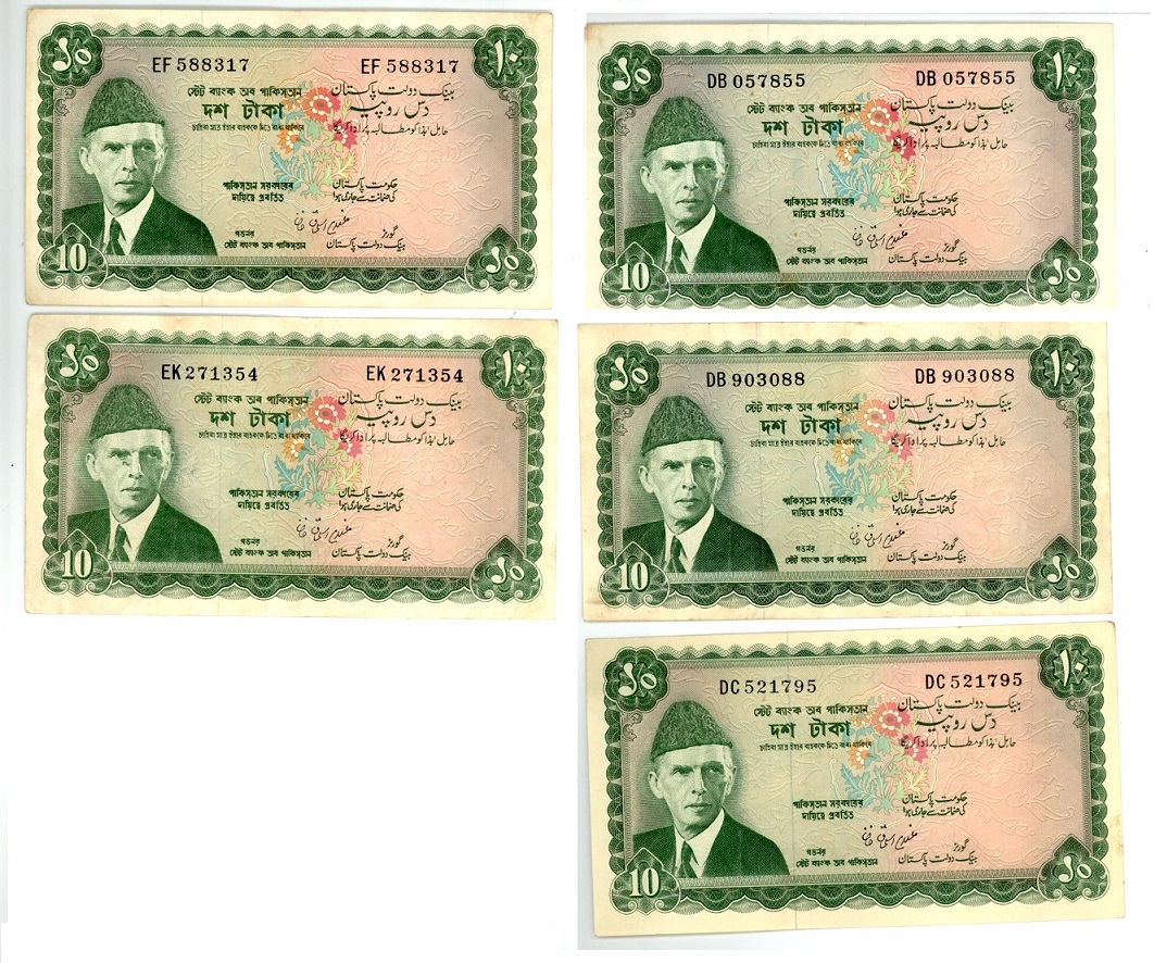 Pakistan Lot of 5 x 10 Rupees Banknote (Tea Garden Green ) Signature by Ghulam Ishaq Khan P.26c – prefix: DB,DB, DC, EF, EK (D.L.Rue)