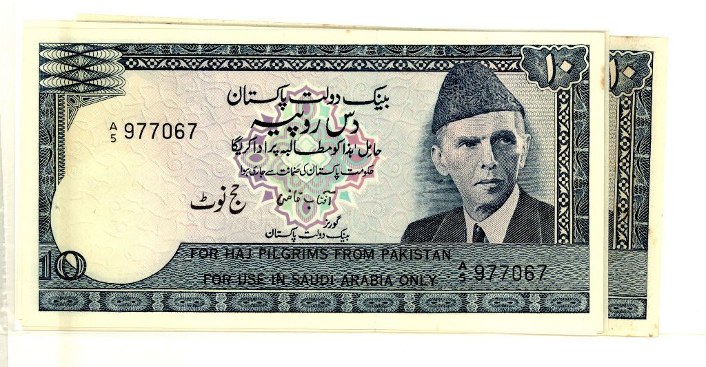 Category Banknotes Lot number 673 Starting Bid 10000 Lot Pictures Pakistan Lot of 9 x 10 Rupeee HAJ NOTE Signature by Aftab Qazi Perfix A/5