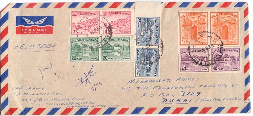 Pakistan Lot of two 1968 perf.shifted block of 4 + one pair of gum side printing + 1974 Registered letter to Dubai-UAE with imperf.pairs.