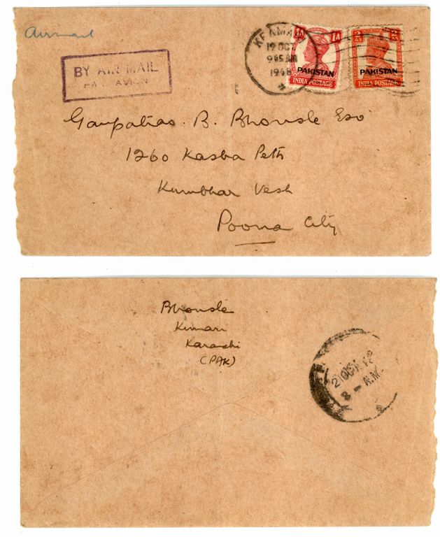 Category Pakistan Overprint Lot number 201 Starting Bid 2000 Lot Pictures 1948 Cover bearing British India KG VI 1a and 2a with Overprint “PAKISTAN” from KEAMARI to POONA India