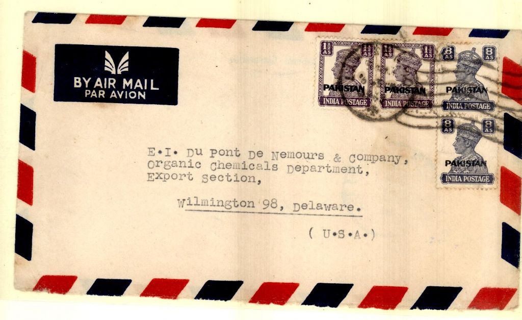 Category Pakistan Overprint Lot number 204 Starting Bid 2000 Lot Pictures Pakistan 1948 Airmail Cover franked 2 x 8a +2 x 1 ½a KG VI Overprint “PAKISTAN” Stamp from Lahore to USA