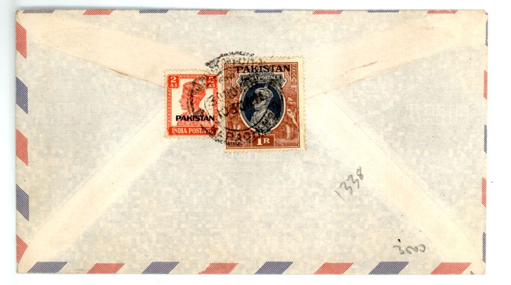 Category Pakistan Overprint Lot number 207 Starting Bid 2000 Lot Pictures Pakistan 1948 Airmail Cover from Karachi to USA franked 1Rupee+2a KG VI Overprint "PAKITAN" Stamps
