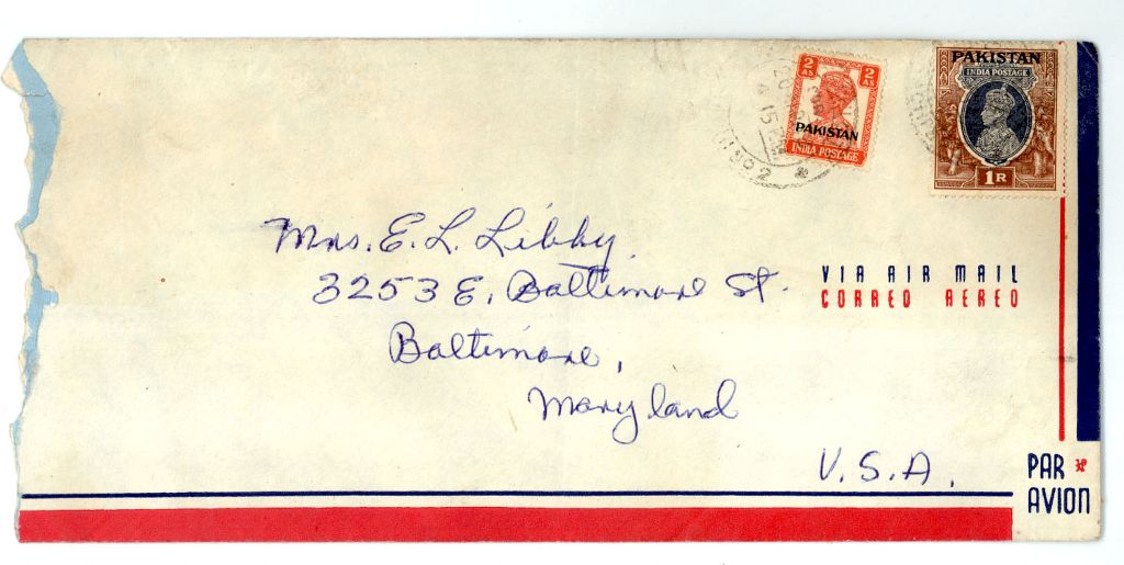 Pakistan 1948 Large Airmail Cover from Karachi to USA franked 1Rupee+2a KG VI Overprint "PAKITAN" Stamps