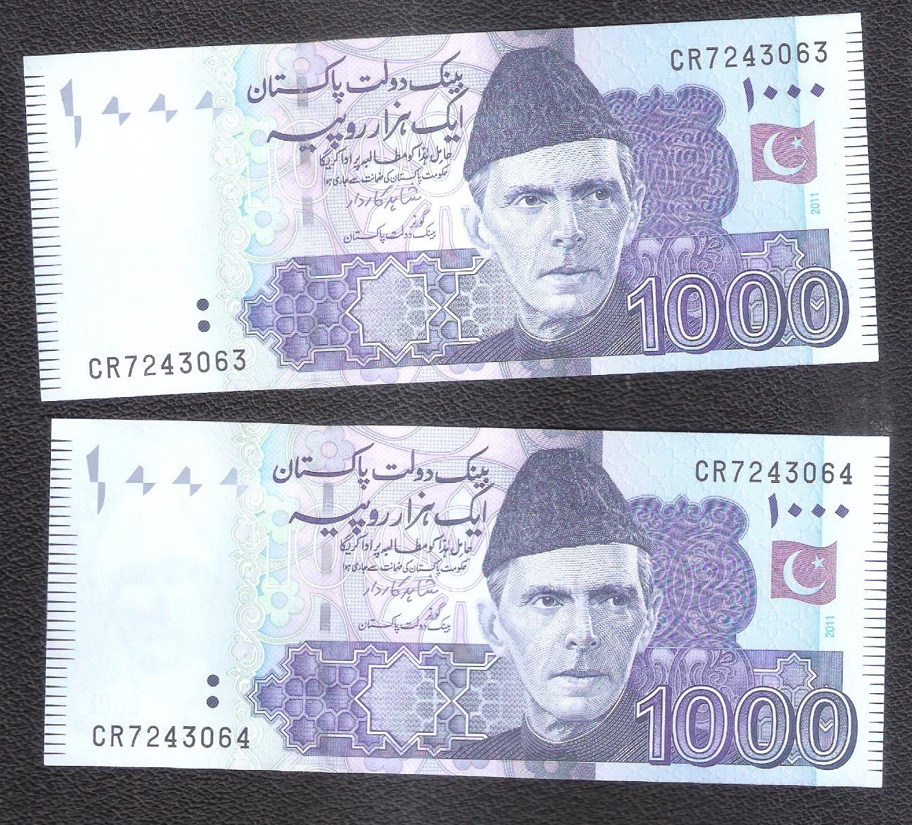 Pakistan Rs 1000 (2 Notes) Signature by Shahid Kardar 2007 Issue prefix (DD2821726-785 & DD2821787-800) UNC