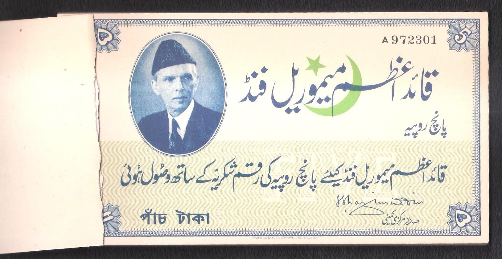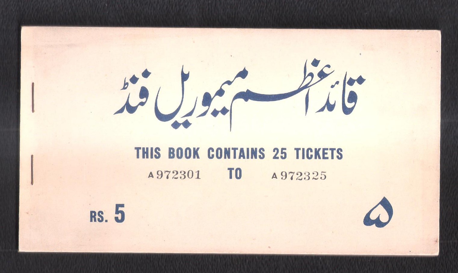 Category Banknotes Lot number 610 Starting Bid 15000 Lot Pictures Quaid-e-Azam Memorial Fund Tickets Rs. 5 Complete Book (25 Tickets) A 972301-A972325 Add to Slideshow Off