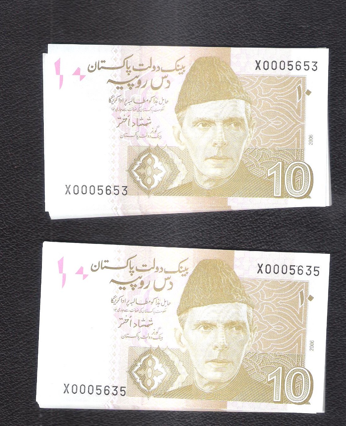 Category Banknotes Lot number 649 Starting Bid 1000 Lot Pictures Pakistan Rs 10 (34 Notes) Signature by Shamshad Akhtar 2006 Issue X prefix (Replacement Notes) UNC Add to Slideshow Off
