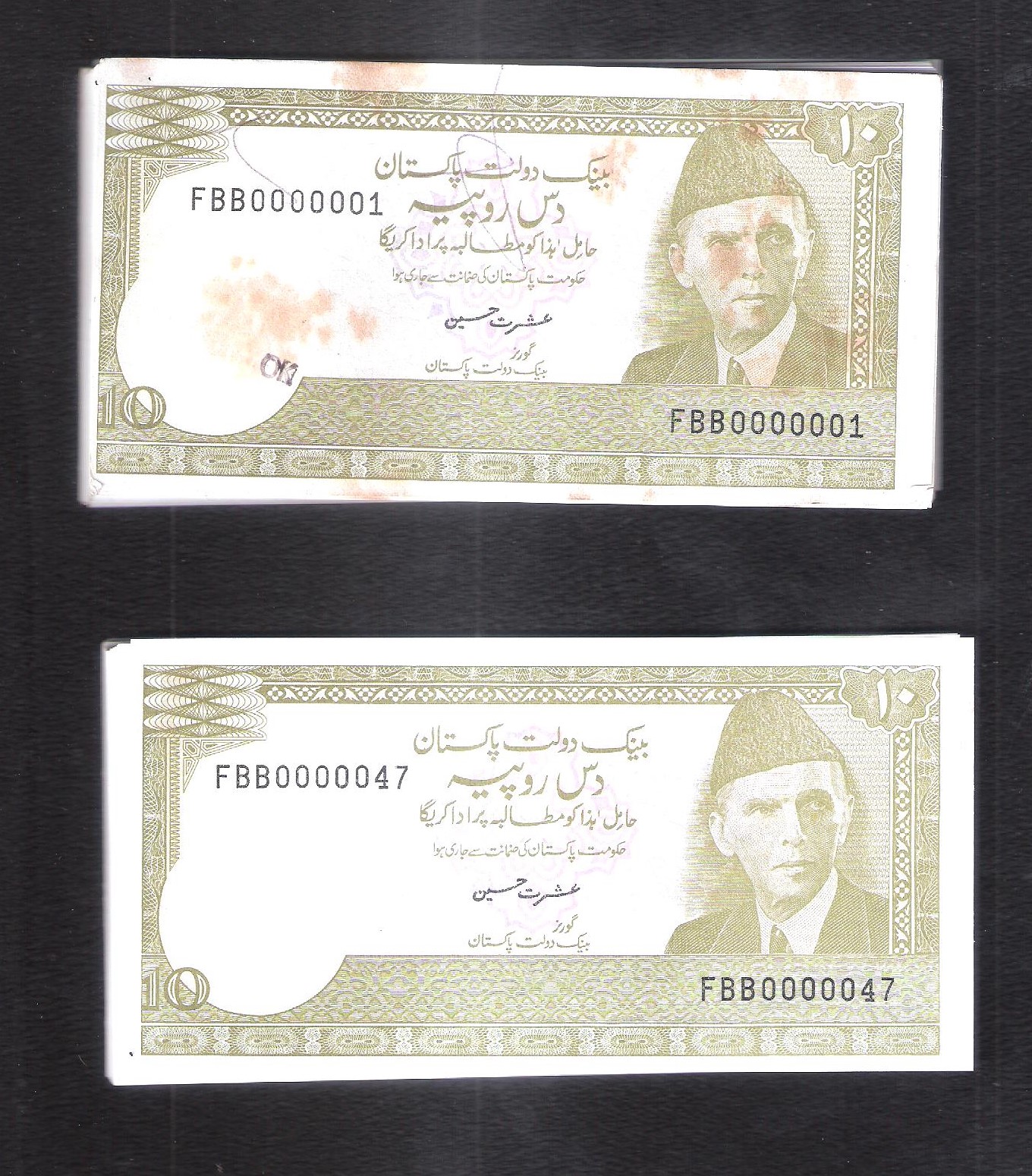 Category Banknotes Lot number 652 Starting Bid 2000 Lot Pictures Pakistan Rs. !0 (81 notes) Signature by Ishrat Hussain prefix FFB condition UNC stain (Serial no FBB00000001) Add to Slideshow Off