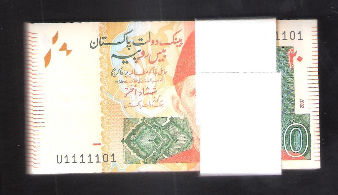 Pakistan Rs 20 (100 Notes Complete Pack) Signature by Shamshad Akhtar 2007 Issue prefix (U 1111101-200 with Solid No U1111111) UNC