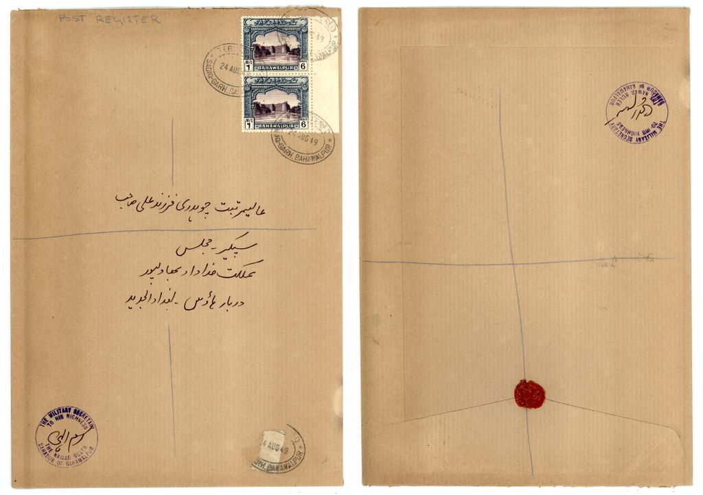 Bahawalpur Large Registered Cover franked with vertical pair of 6 anna  definitive  (SG 26)  stamp cancelled by Elliptical  of REGISTERED/BAHAWALPUR dated 24 Aug  1949 with PFP Certificate