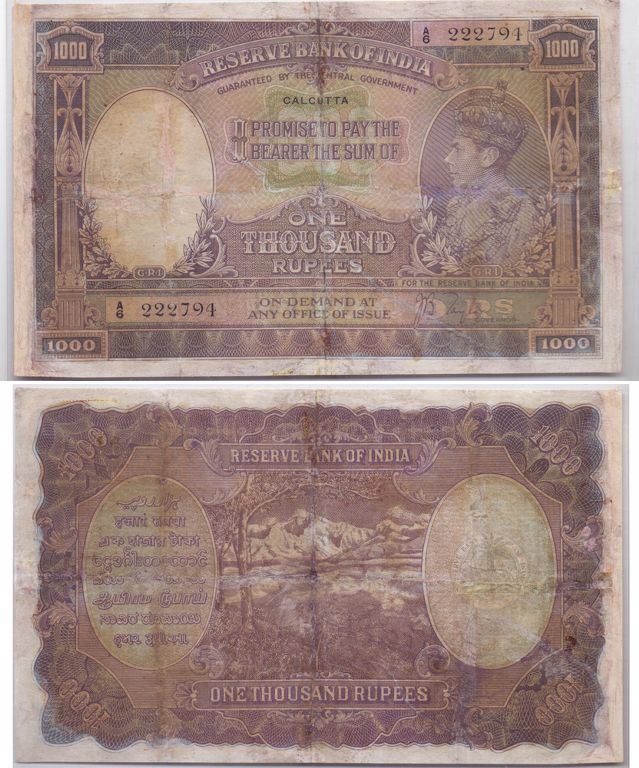 British India 1937 KGVI 1000-Rupees P-21b sign J.B Taylor CALCUTTA F-VF.