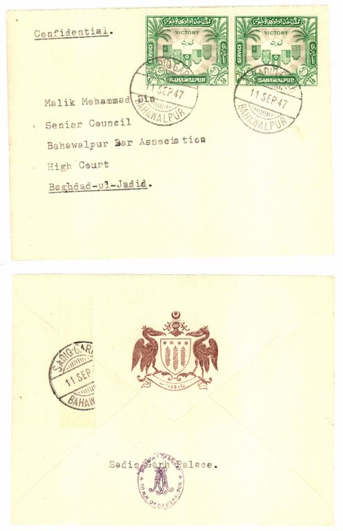 Bahawalpur confidential Cover franked with horizontal pair 1 ½ SERVICE Victory Issue stamps cancelled by bridge type circular date stamp of SADIQ-GARH/BAHAWALPUR dated 11 SEP 1947 with PFP Certificate