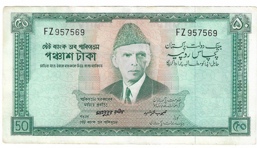 Category Banknotes Lot number 617 Starting Bid 3000 Lot Pictures Pakistan Rs 50 Signature by Mehbob-ur-Raschid (Green) Condition XF+