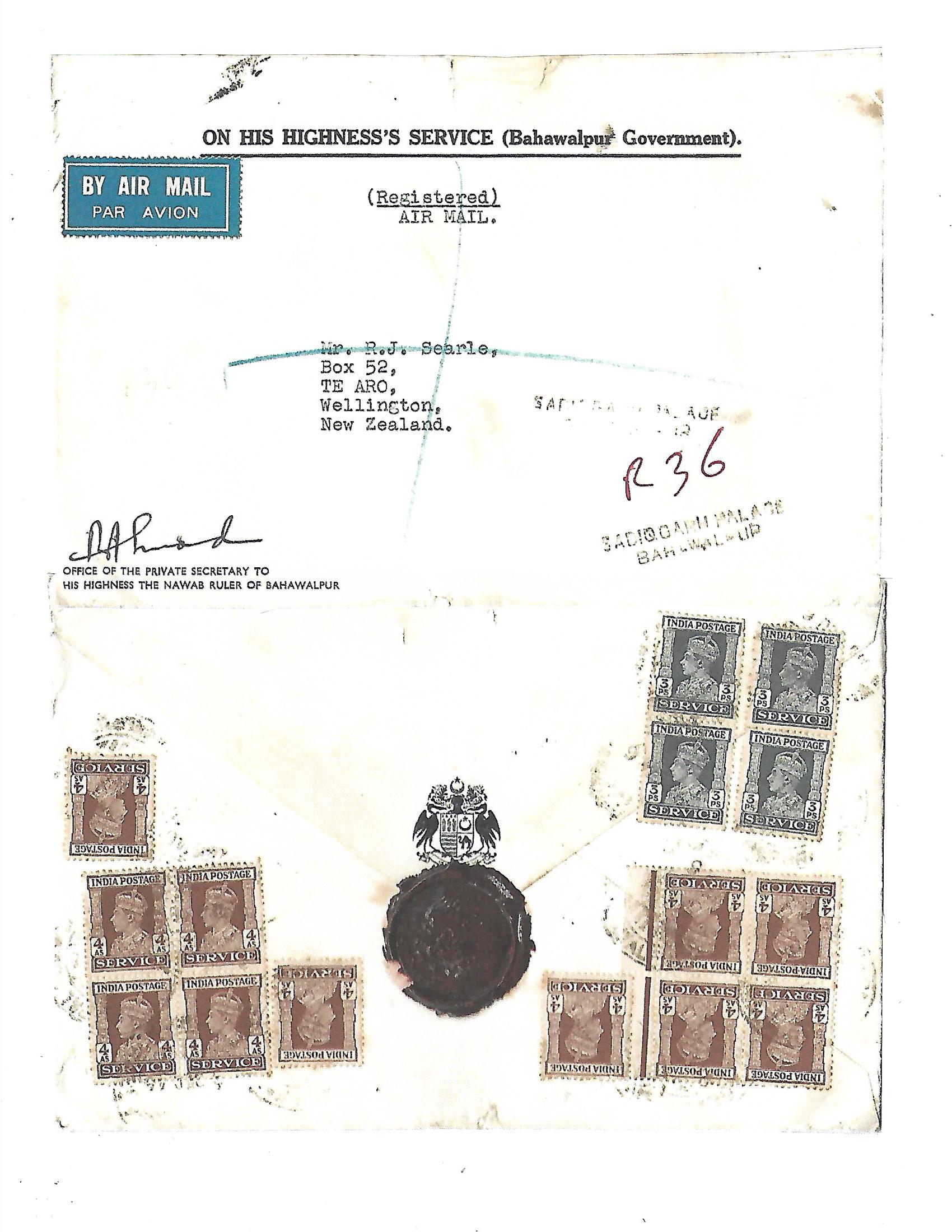 Bahawalpur - 1946 Official On His Highness's Service cover of Bahawalpur Government mailed from Sadiqgarh Palace to New Zealand with multiple KG VI service stamps of the period