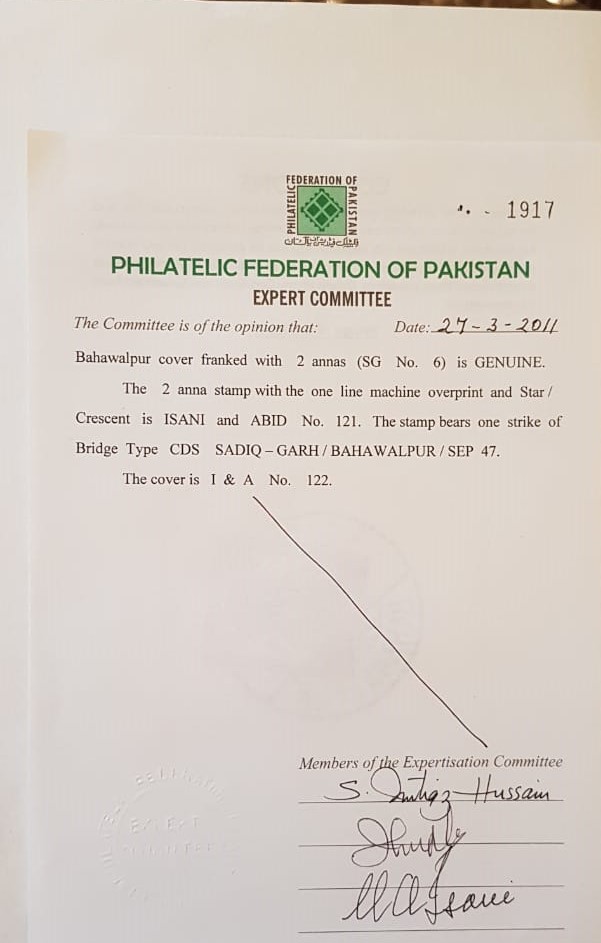 Bahawalpur Cover Franked with 2 anna KG VI (SG 6) with one line machine overprint State Bahawalpur and Star Crescent cancelled with SADIQ-GARH/BAHAWALPUR dated SE{ 1947 with PFP Certificate
