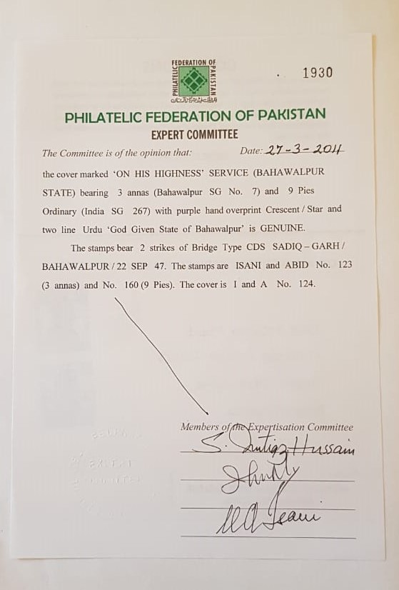 Bahawalpur ON HIS HIGHNESS SERVICE BAHAWALPUR Cover bearing 3 a & 9p Overprint Crescent and Star cancelled SADIQ-GARH/BAHAWALPUR dated 22 Sep 1947 with PFP Certificate