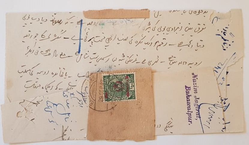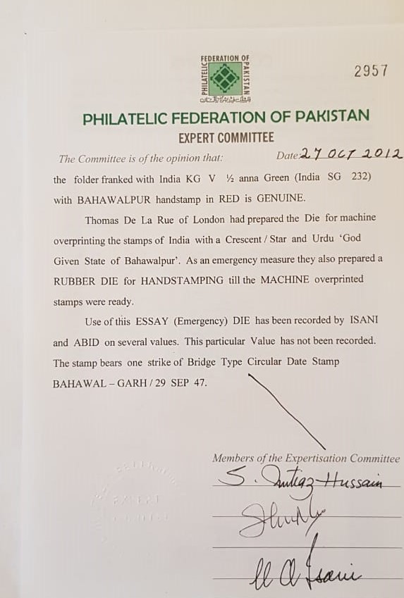 Bahawalpur a folder franked with KG V half anna green with single line handstamp overprint in RED cancelled with BAHAWAL - GARH dated 29 Sep 1947 with PFP certificate