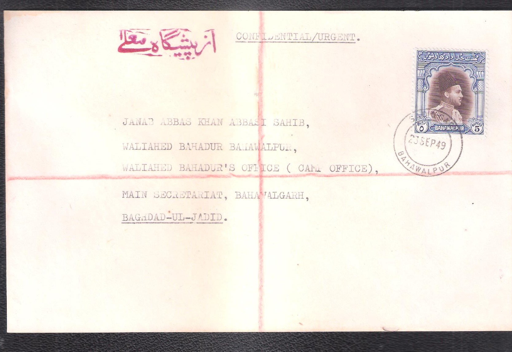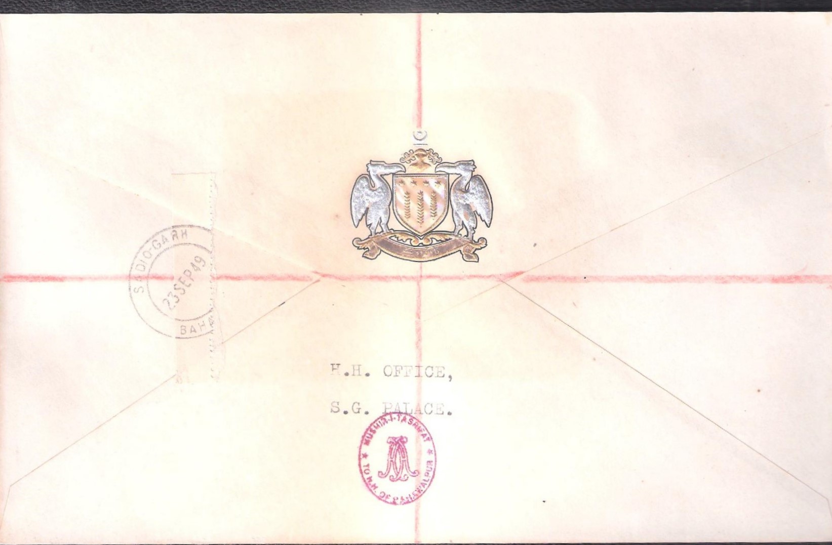 Category Bahawalpur Lot number 508 Starting Bid 25000 Lot Pictures Bahawalpur Cover franked with 5 Rupee Nawab Stamp from SADIQ-GARH dated 23 Sep. 1949