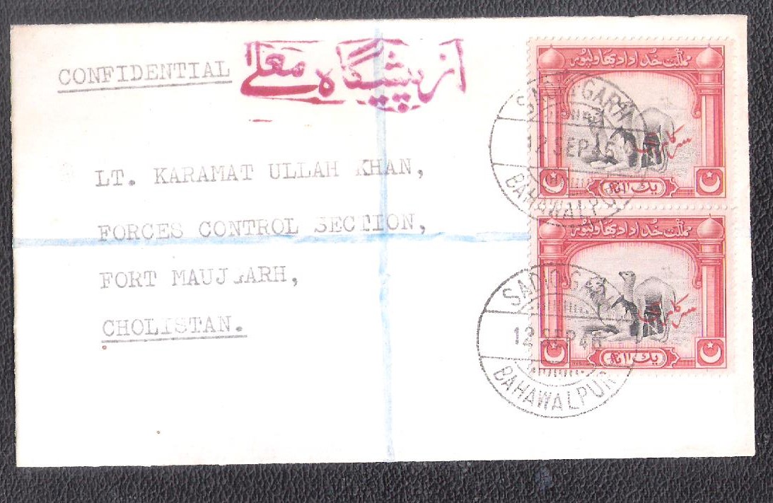 Bahawalpur Cover franked with 2 x 1 anna Camle and clif from SADIQ-GARH dated 12 Sep. 1948