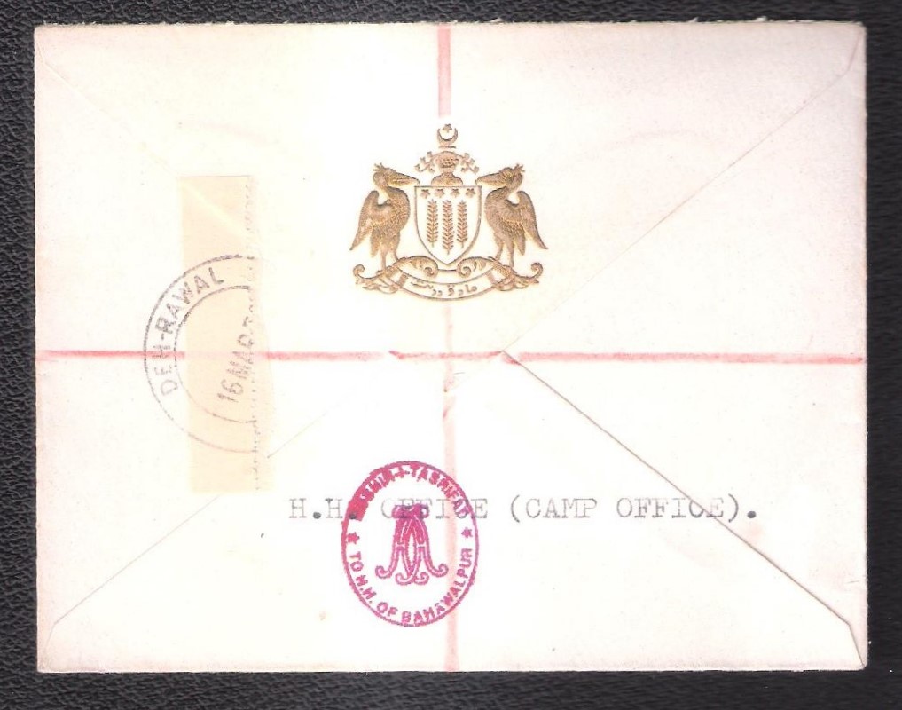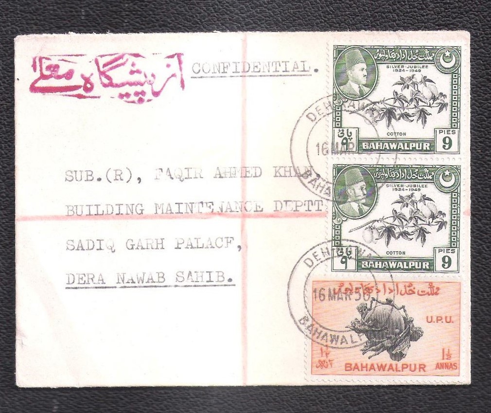 Bahawalpur Cover franked with 2 x 9p Silver Jubliee and 1 1/2 anna UPU from DEHA-RAWAL dated 16 Mar 1950