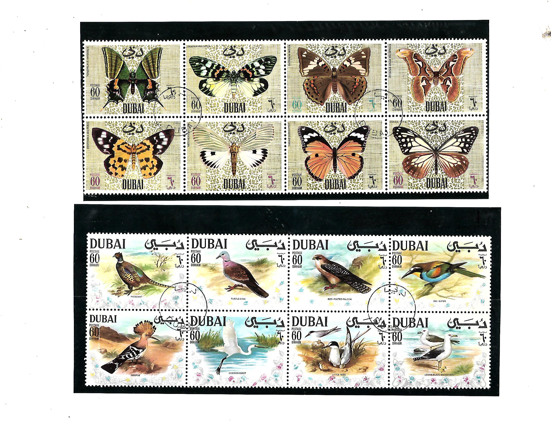 Dubai: Thematic sheetlets of 8 stamps each x 4 of Butterflies, Birds, Flowers and Fishes issued in 1968. Original gum
