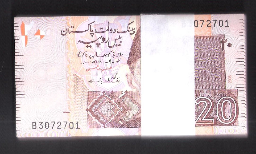 Pakistan Rs 20 (99 Notes) Signature by Ishrat Hussain 2005 Issue B prefix missing 786 UNC