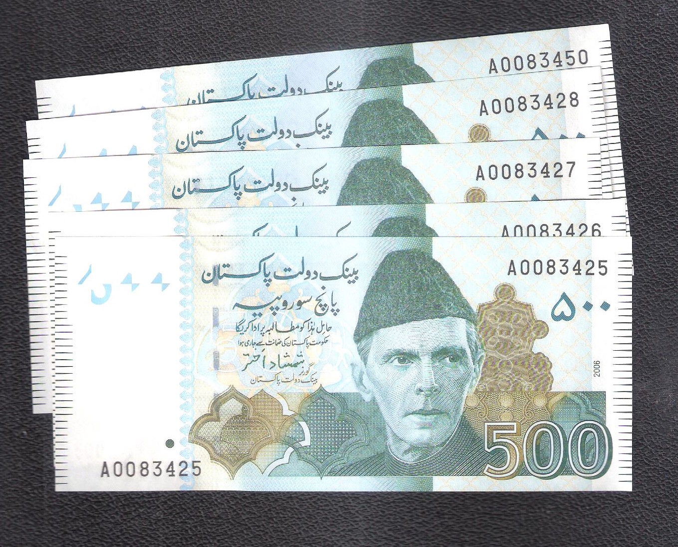 Category Banknotes Lot number 617 Starting Bid 3000 Lot Pictures Pakistan Rs 500 ( 5Notes) Signature by Shamshad Akhtar 2006 Issue A prefix UNC Add to Slideshow Off