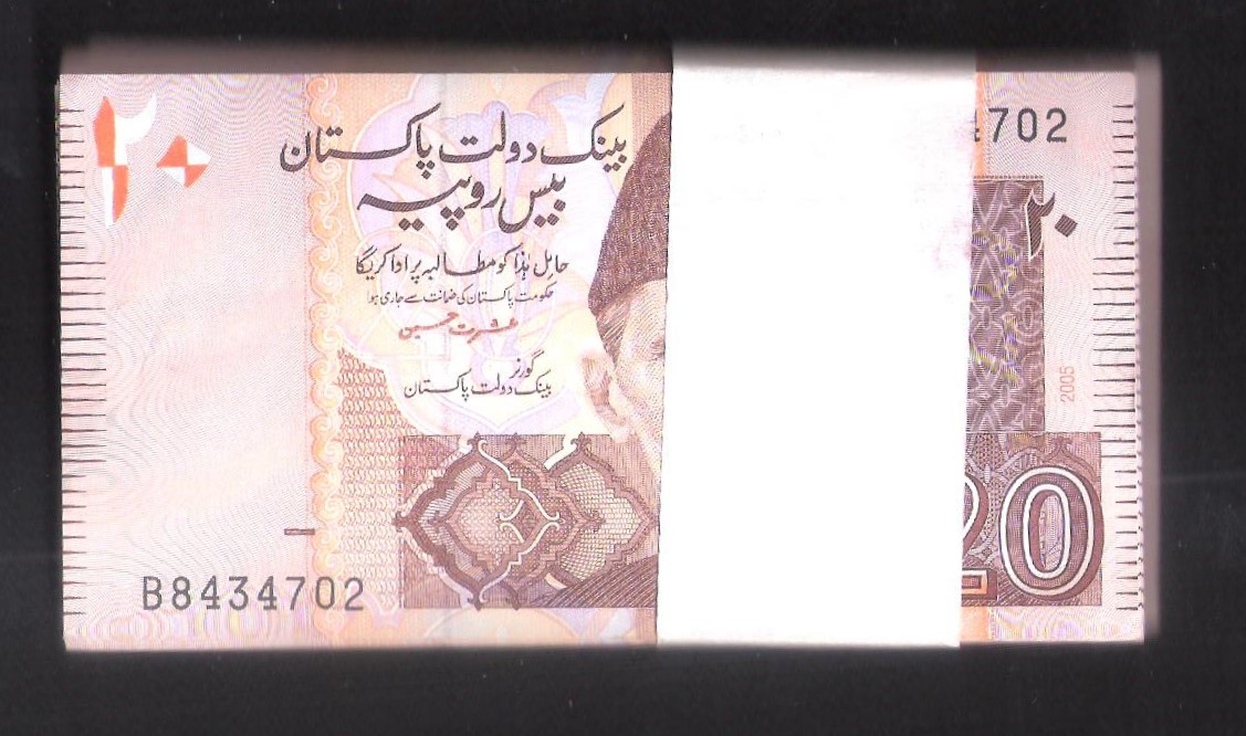 Pakistan Rs 20 (98 Notes) Signature by Ishrat Hussain 2005 Issue B prefix missing 701 & 786 UNC