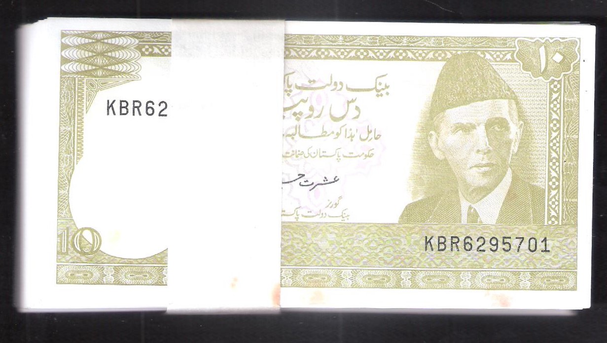 Pakistan Rs. !0 (99 notes) Signature by Ishrat Hussain prefix KBR condition UNC few top notes with stain (786 missing)