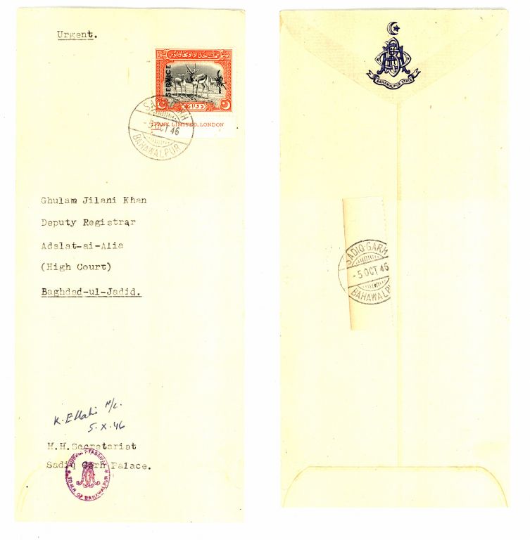 Bahawalpur Cover franked with 2 anna SGo16SERVICE stamp cancelled by brige type circular date stamp of SADIQ-GARH/BAHAWALPUR dated 5 Oct 1946 with PFP Certificate