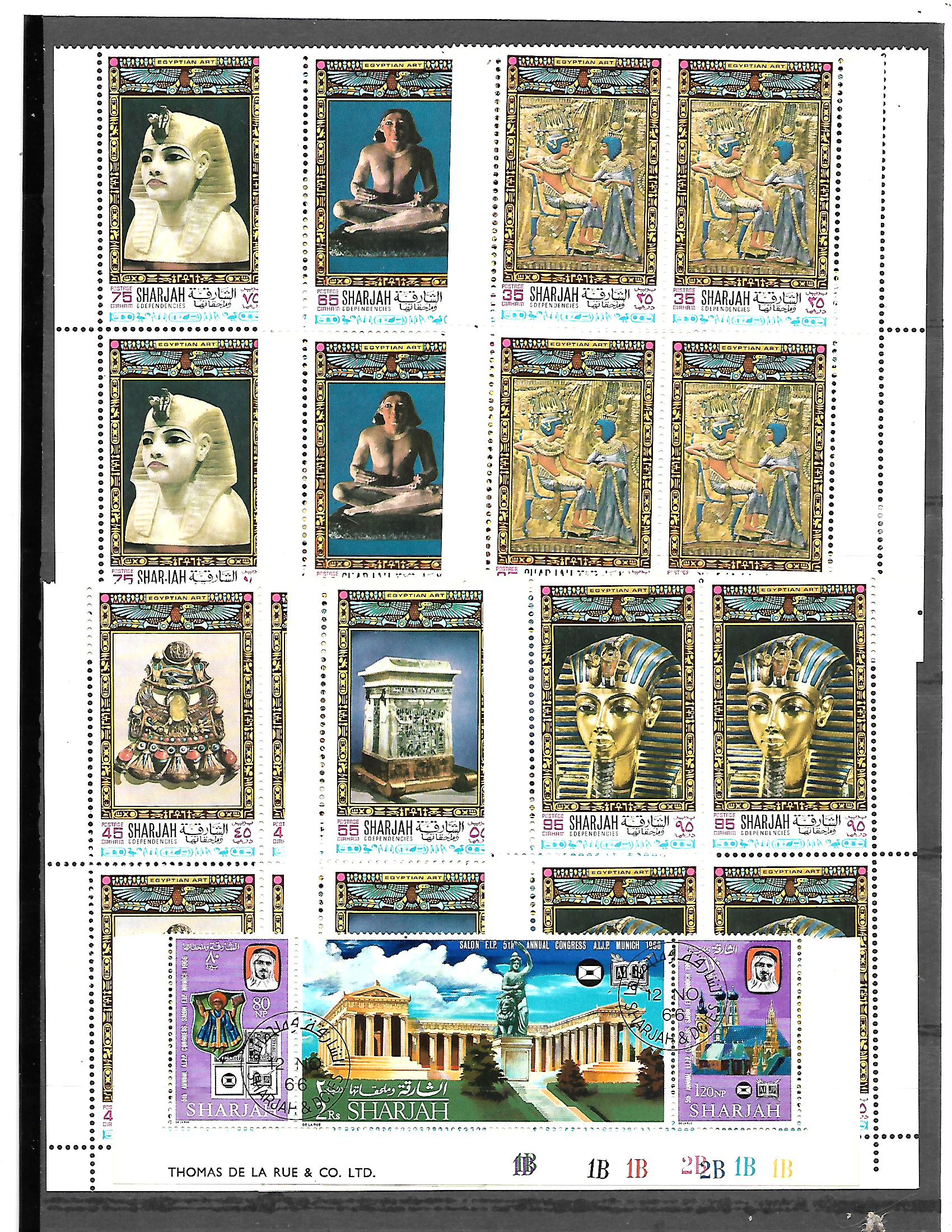 Sharjah, lot of total 8 blocks of 32 stamps mint with original gum of the Egyptian Art series. included is a scarce strip of 1966 Congress of Association of International Philatelic Journalists and Authors held in Munich, West Germany.
